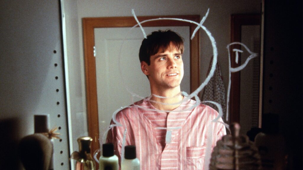 We meet Truman Burbank (Jim Carrey), who is the most boring guy you’ve ever met, interesting only due to his exposure. His prefabricated reality takes place in a fake town called Seahaven, which is all clean lawns, the chipper neighbors, the office job. On the surface, it’s not all that different from mundane American suburbia, fake as it is, which is the joke, of course. The line between a manufactured life and an authentic one is not just thin but unknowlable, and it cuts at the very core of the stories we tell about ourselves. Truman is Adam in his garden and Noah on his boat and Jesus ascending to the heaves. He’s also a weirdo with cartoonish neuroses bursting out of his limbs, because he is, after all, being played by Jim Carrey, whose elastic physicality here becomes a kind of argument for the soul trapped inside a sitcom body. Carrey plays a man on the verge of losing his mind, and part of the thrill is the suspicion that some of the insanity is hardwired into the performer, leaking through the character like light through a crack in the set.